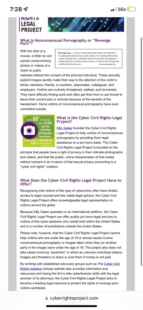I was lead plaintiff in a class action lawsuit against Boston University regarding tuition refund. That lawsuit has ended and I am still concerned about continued nonconsensual pornography, suspected stalking, and public harassment and slander. The privacy concerns have been continuous for about a year and a half. There has been emotional, financial, and physical damage that I have documented. At first I thought I was being egotistical and couldn’t believe someone would care enough about me to record me and my partners naked. I’ve had multiple camera and microphone scans professionally done. I’ve spoken with the lawyer representing me for the BU lawsuit multiple times regarding privacy concerns. Now, I know it’s not BU because I’m in California and the lawsuit is dismissed. I require some representation and protection because this is ruining my friendships and relationships. I hope I was concise enough and hope to hear from your staff or legal team soon. Oli